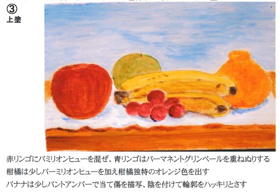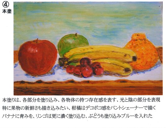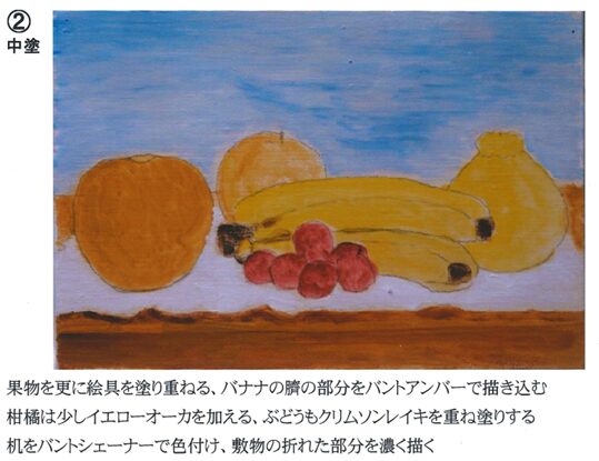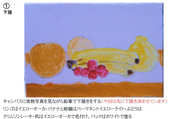 卓上の果実の題で、写真と下描きしたキャンバスを用意しております。中塗→上塗→本塗の順にSMサイズの1枚絵を完成近くまで描いていただきます