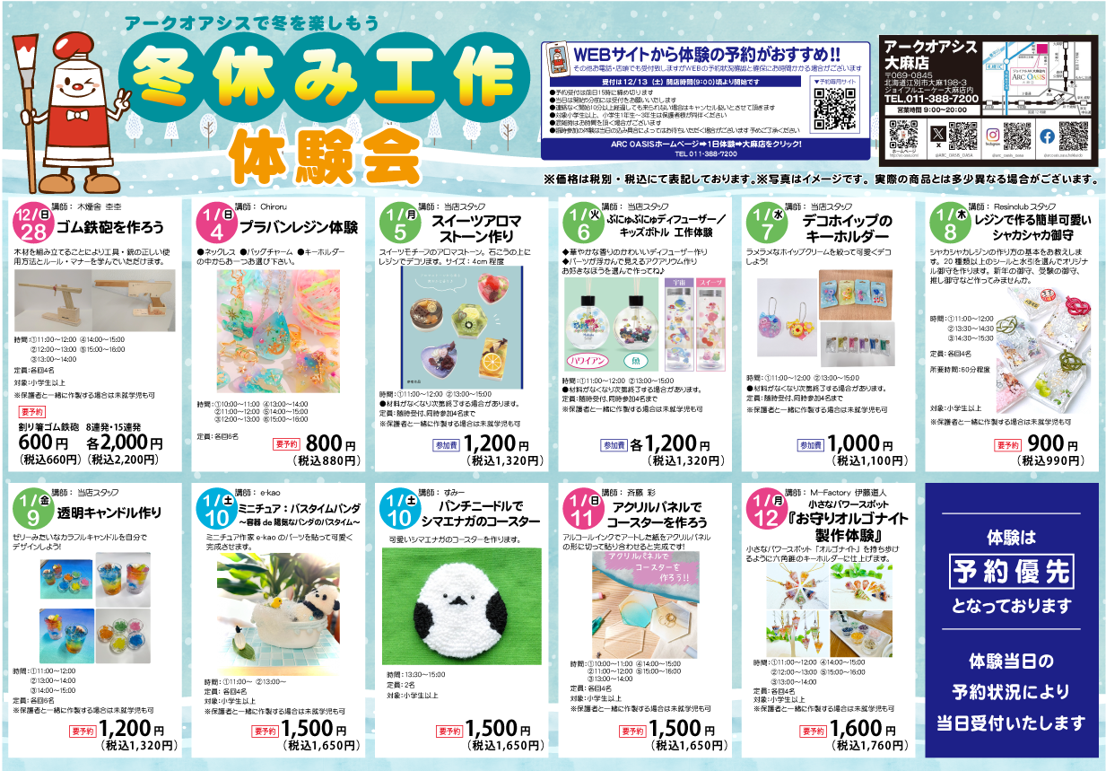 アークオアシス大麻店では、この冬休みに親子で楽しめる「冬休み工作体験」を開催いたします。
