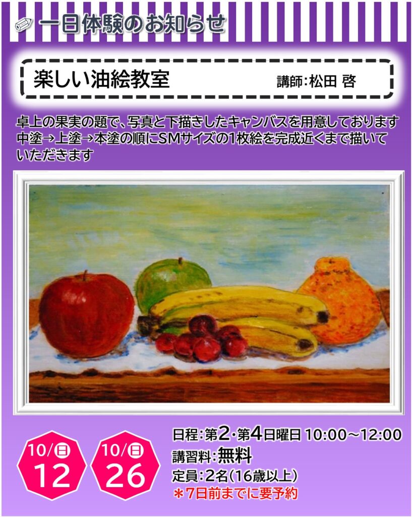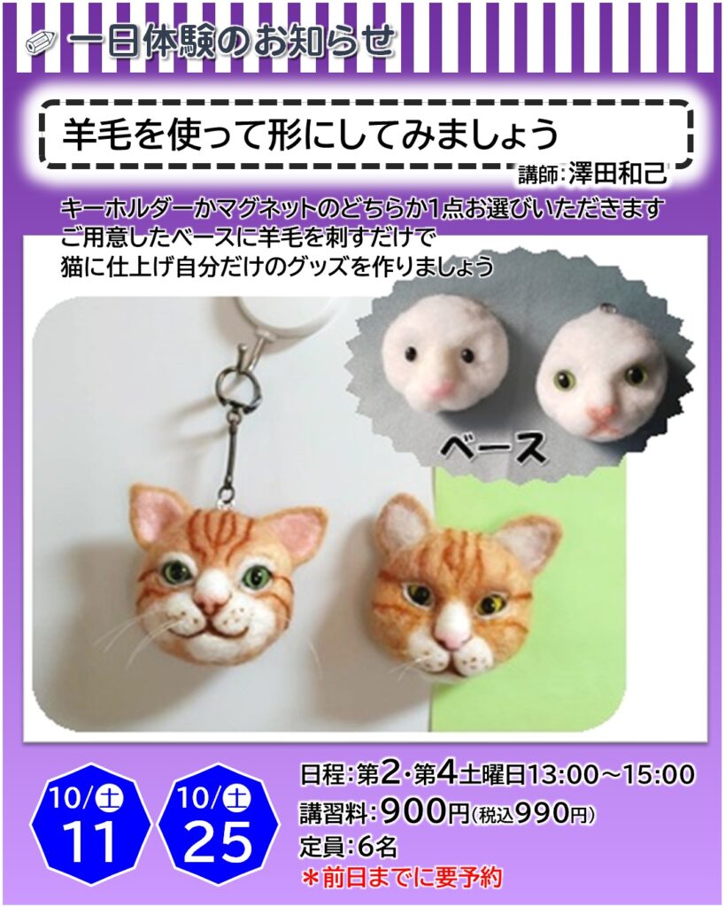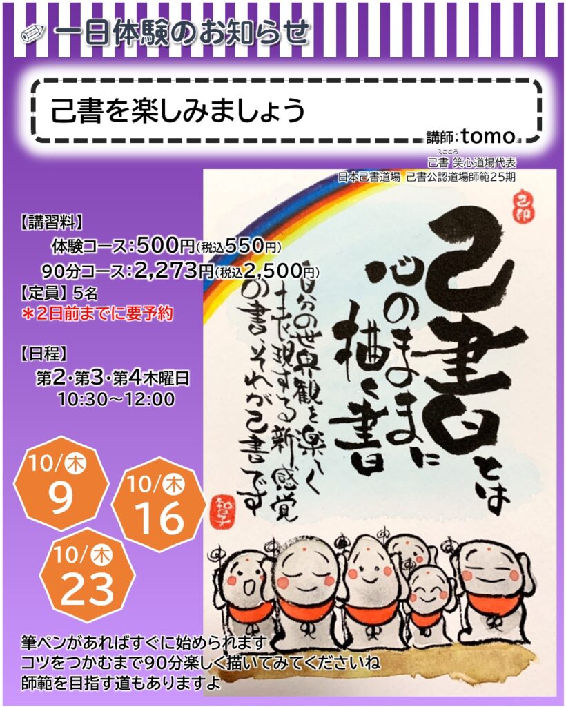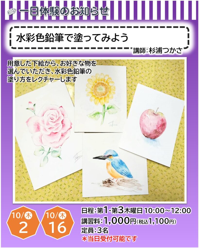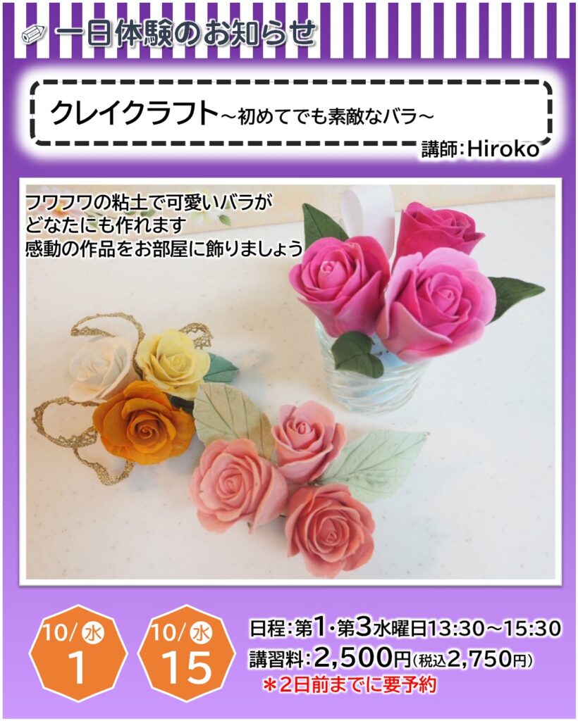 お知らせ カルチャー講師による一日体験【10月】日程をご紹介 2025年9月22日 寝屋川店 ●予約申し込みが必要となります・・・店頭、電話、ホームページにて受付しております●受付期限にご注意ください(日程はやむを得ず変更となる場合もございます)●教室内にてカルチャー生徒さんと同時受講となります(未開講の場合は体験者のみで実施いたします) 申込予約はこちら 一日体験日程 《10月ver.》 カレンダーを選択すると申込予約ページに移ります お知らせTOP