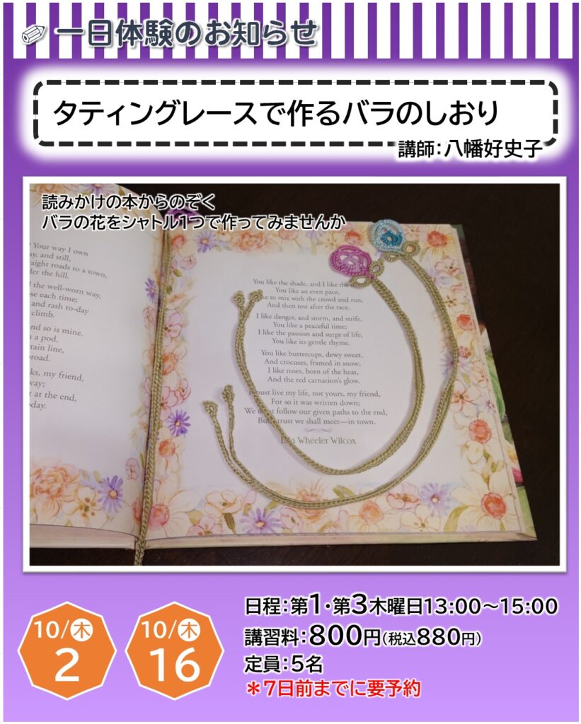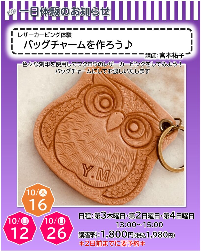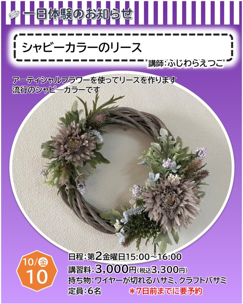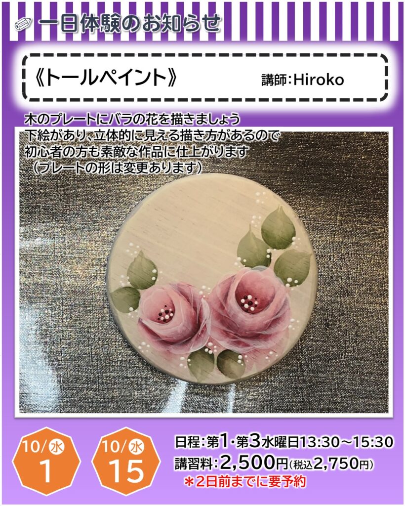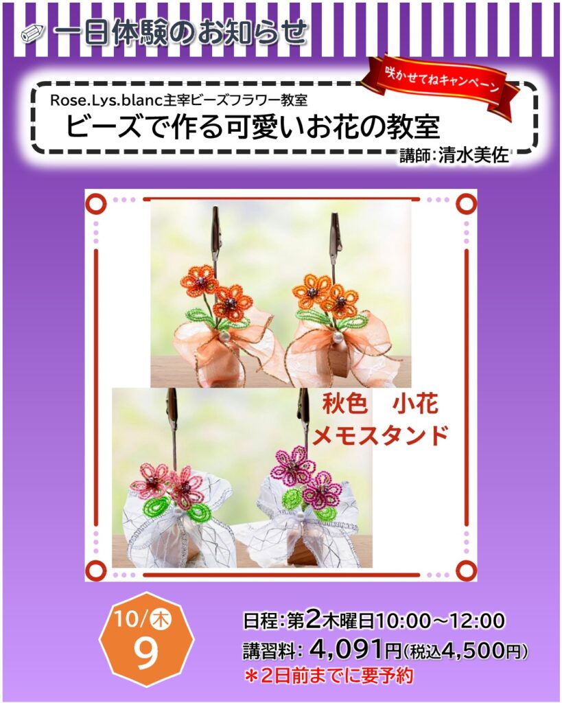お知らせ カルチャー講師による一日体験【10月】日程をご紹介 2025年9月22日 寝屋川店 ●予約申し込みが必要となります・・・店頭、電話、ホームページにて受付しております●受付期限にご注意ください(日程はやむを得ず変更となる場合もございます)●教室内にてカルチャー生徒さんと同時受講となります(未開講の場合は体験者のみで実施いたします) 申込予約はこちら 一日体験日程 《10月ver.》 カレンダーを選択すると申込予約ページに移ります お知らせTOP