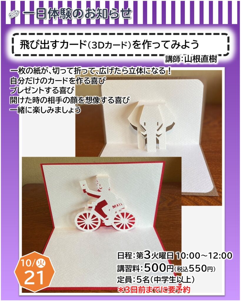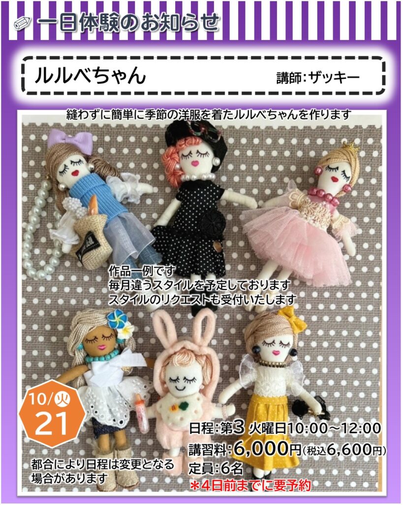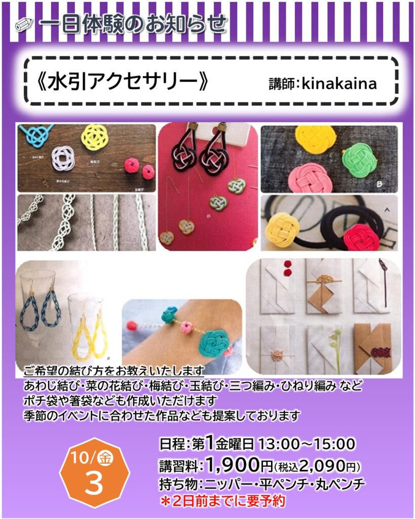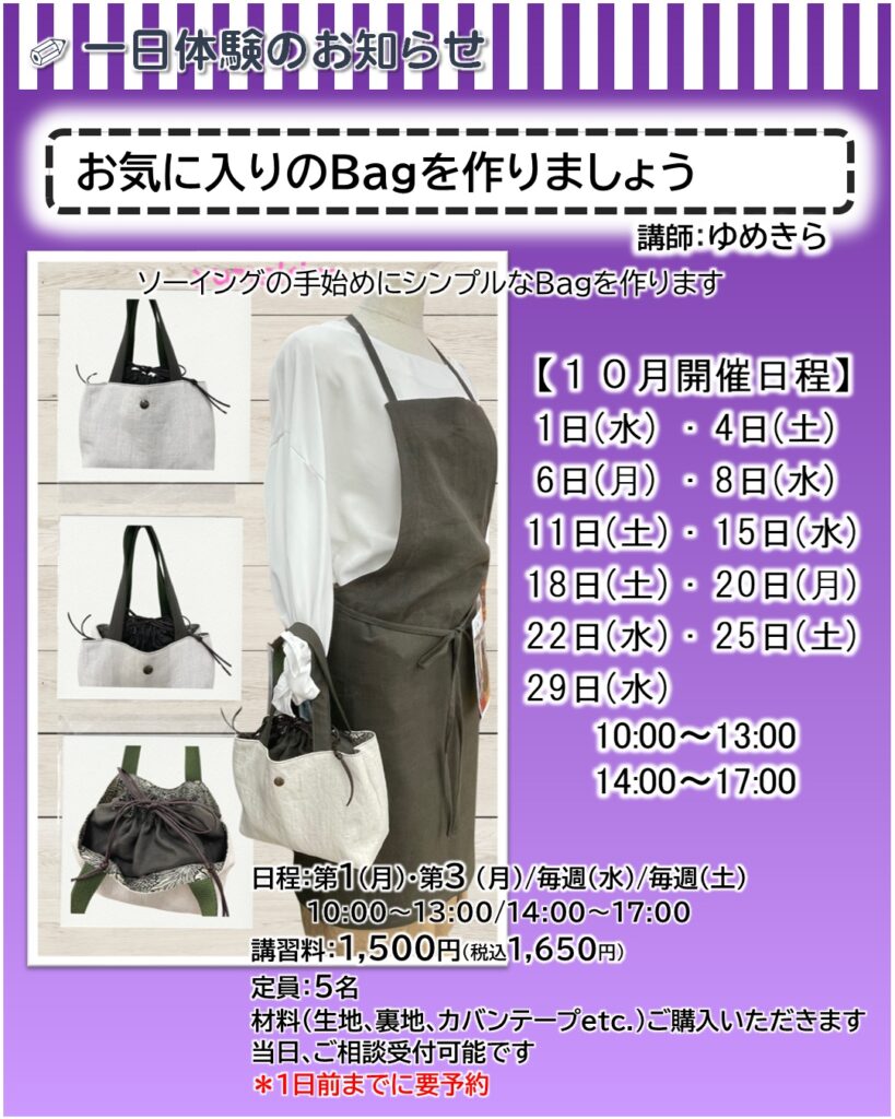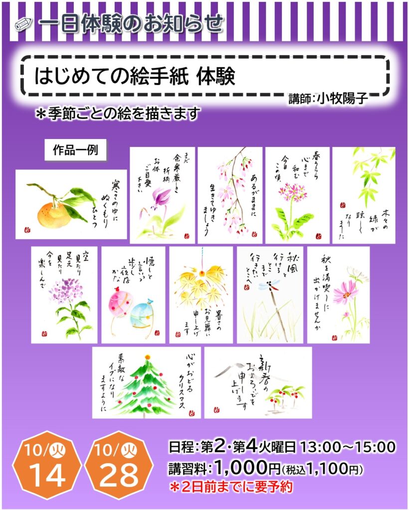 お知らせ カルチャー講師による一日体験【10月】日程をご紹介 2025年9月22日 寝屋川店 ●予約申し込みが必要となります・・・店頭、電話、ホームページにて受付しております●受付期限にご注意ください(日程はやむを得ず変更となる場合もございます)●教室内にてカルチャー生徒さんと同時受講となります(未開講の場合は体験者のみで実施いたします) 申込予約はこちら 一日体験日程 《10月ver.》 カレンダーを選択すると申込予約ページに移ります お知らせTOP