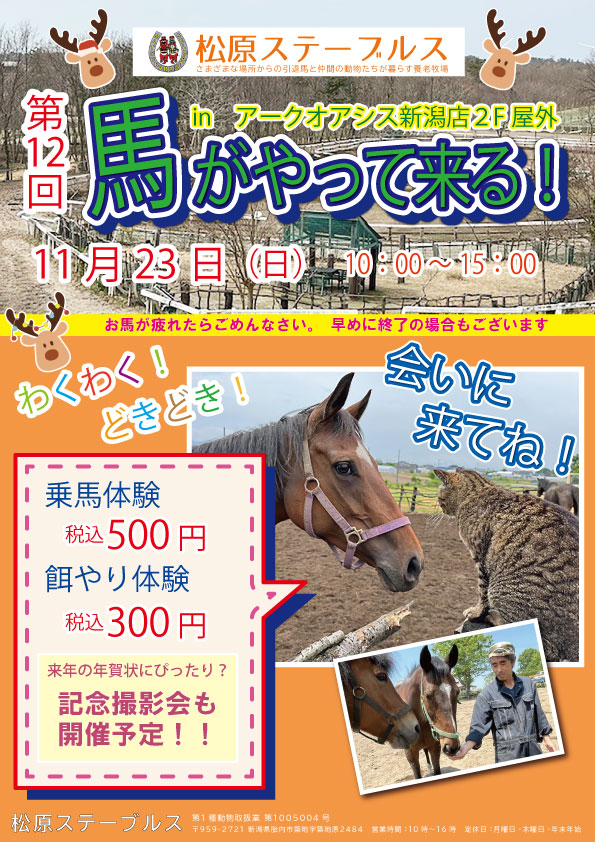 開催日:2025年11月23日(日) 10:00~15:00 ※お馬さんが疲れたら、早めに終了となる場合もございます。