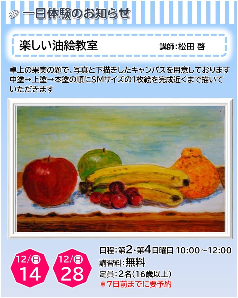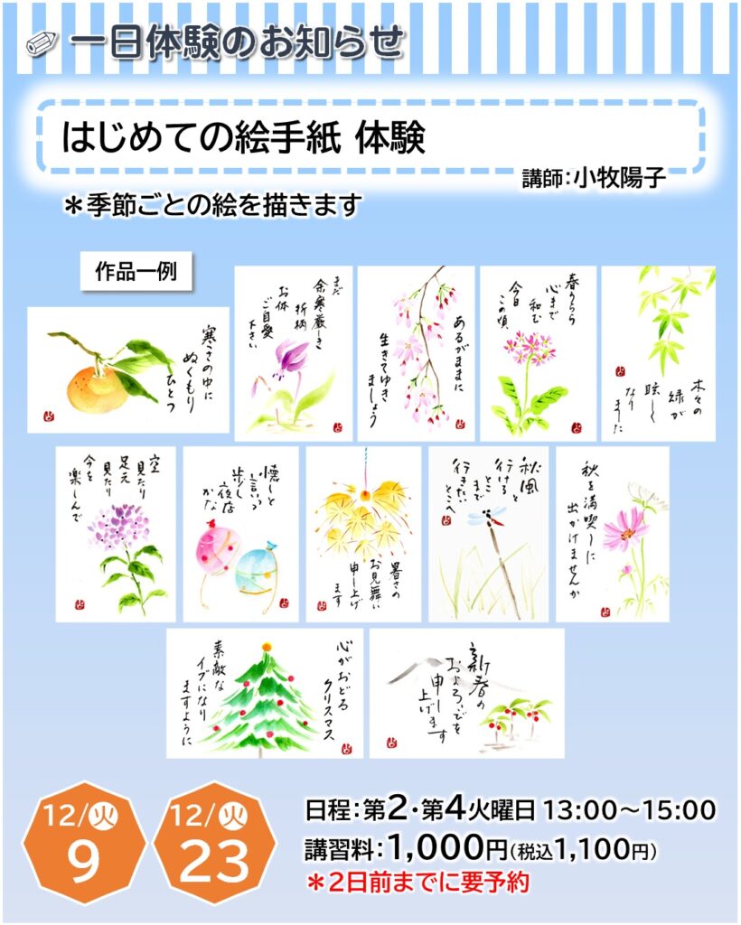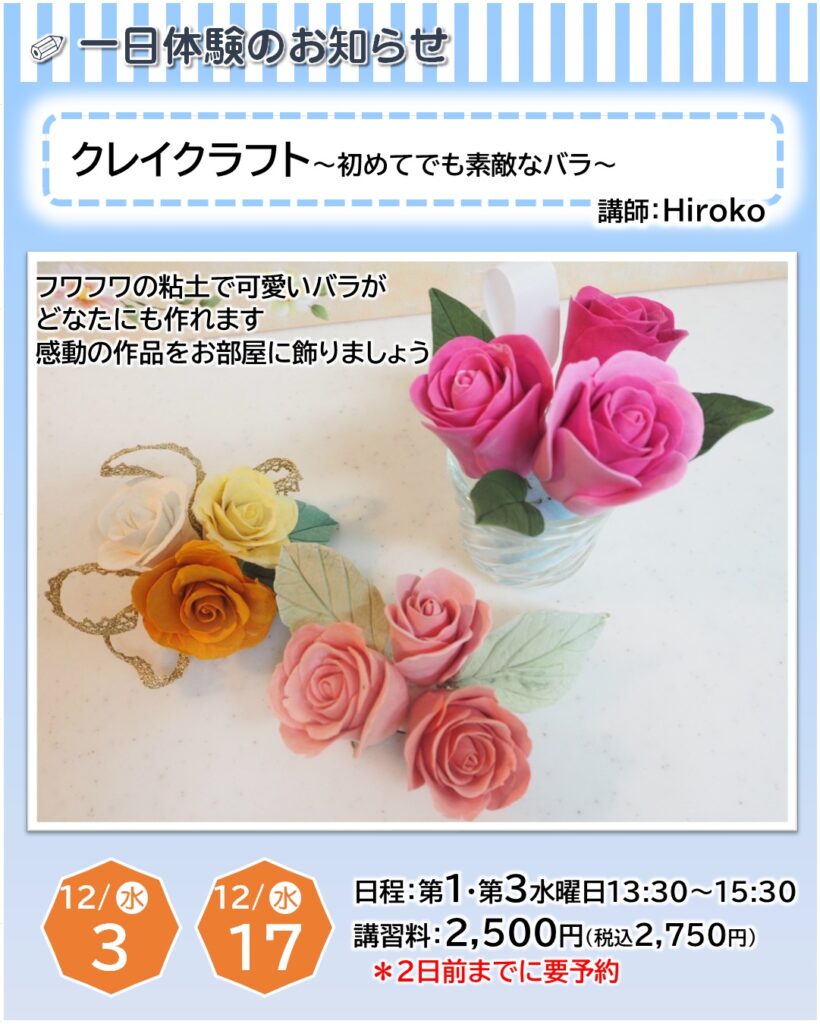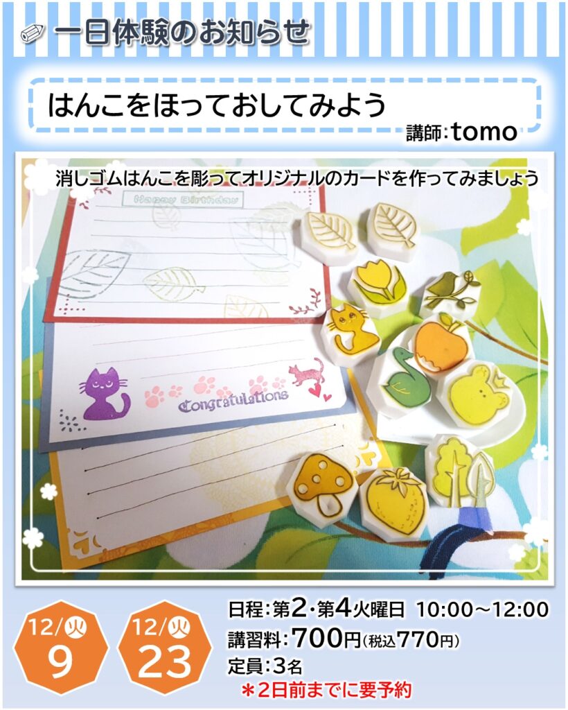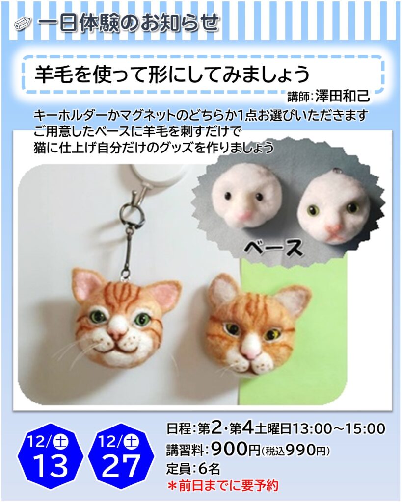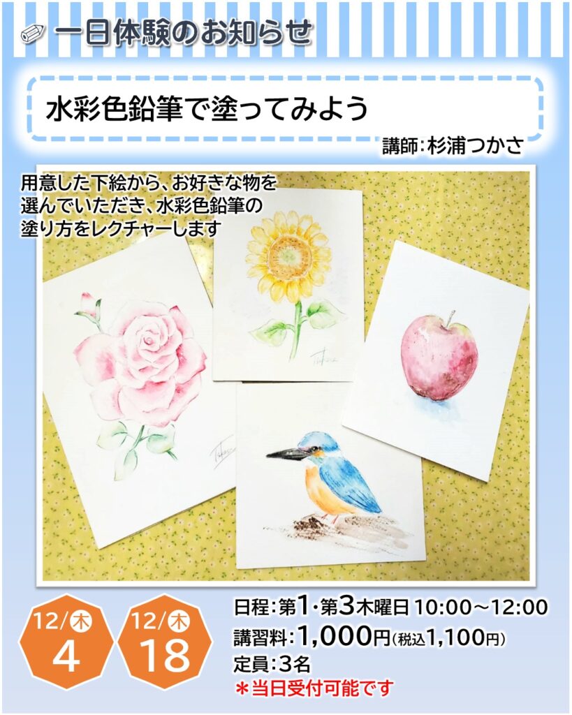 お知らせ カルチャー講師による一日体験【12月】日程をご紹介 2025年11月21日 寝屋川店 ●予約申し込みが必要となります・・・店頭、電話、ホームページにて受付しております●受付期限にご注意ください(日程はやむを得ず変更となる場合もございます)●教室内にてカルチャー生徒さんと同時受講となります(未開講の場合は体験者のみで実施いたします) 申込予約はこちら 一日体験日程 《12月ver.》 カレンダーを選択すると申込予約ページに移ります お知らせTOP
