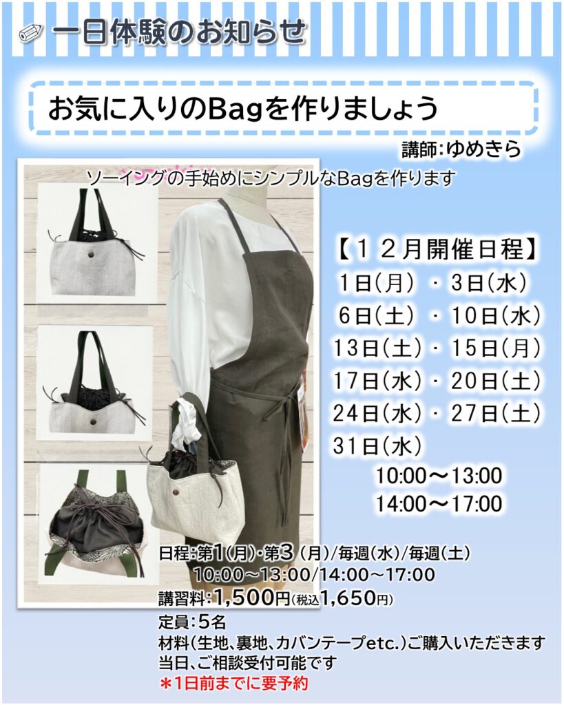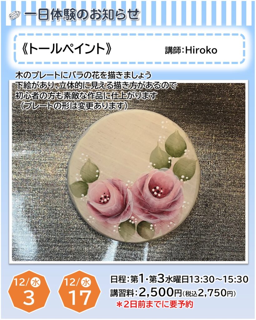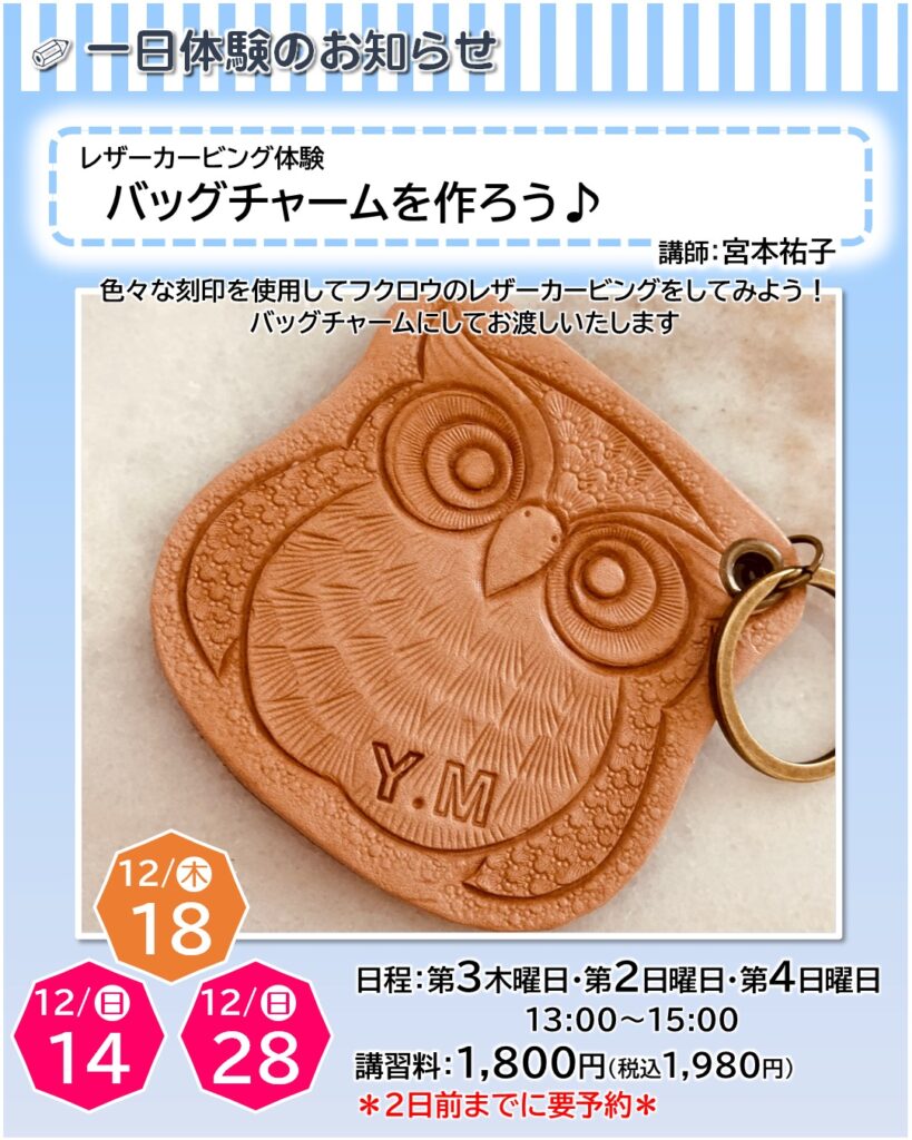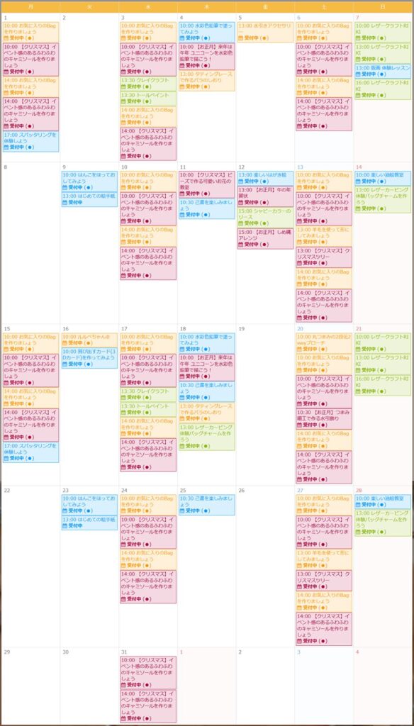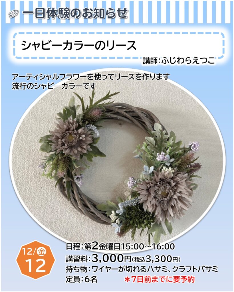お知らせ カルチャー講師による一日体験【12月】日程をご紹介 2025年11月21日 寝屋川店 ●予約申し込みが必要となります・・・店頭、電話、ホームページにて受付しております●受付期限にご注意ください(日程はやむを得ず変更となる場合もございます)●教室内にてカルチャー生徒さんと同時受講となります(未開講の場合は体験者のみで実施いたします) 申込予約はこちら 一日体験日程 《12月ver.》 カレンダーを選択すると申込予約ページに移ります お知らせTOP