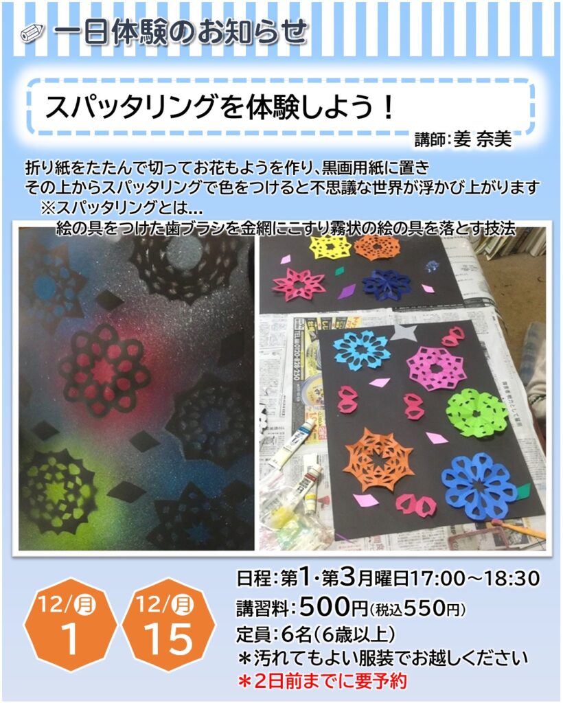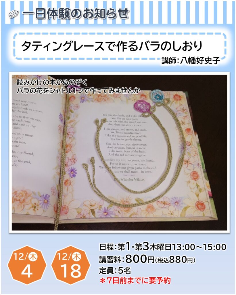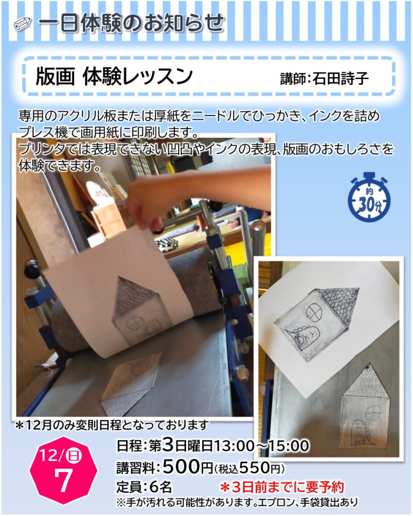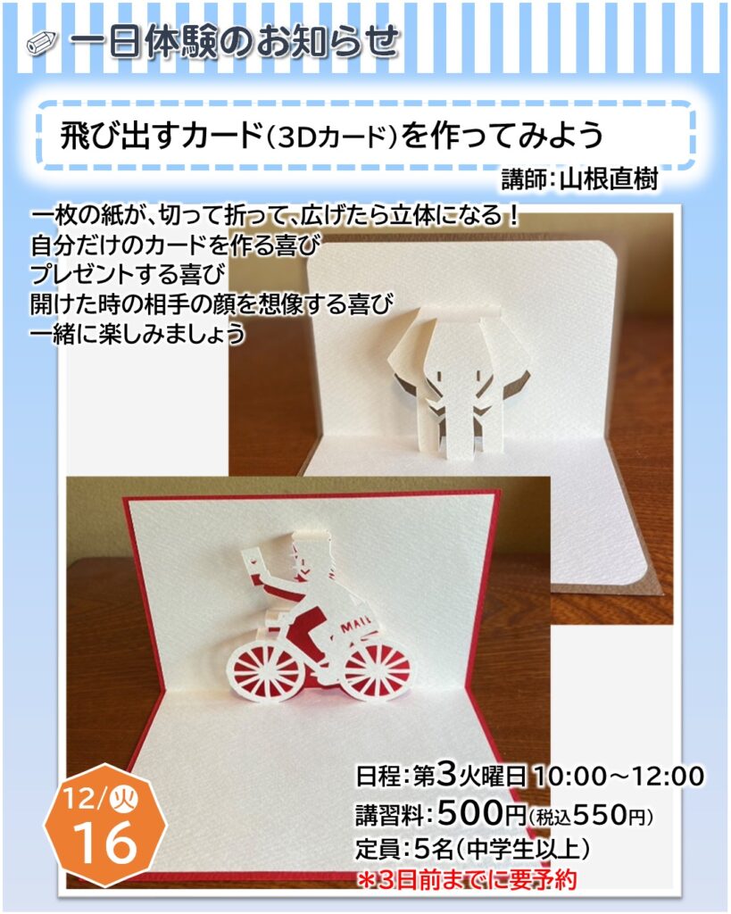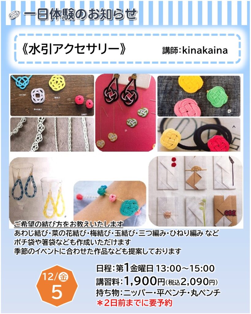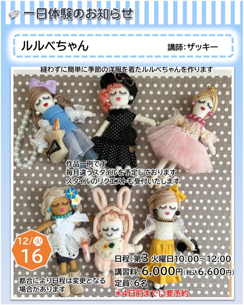 お知らせ カルチャー講師による一日体験【12月】日程をご紹介 2025年11月21日 寝屋川店 ●予約申し込みが必要となります・・・店頭、電話、ホームページにて受付しております●受付期限にご注意ください(日程はやむを得ず変更となる場合もございます)●教室内にてカルチャー生徒さんと同時受講となります(未開講の場合は体験者のみで実施いたします) 申込予約はこちら 一日体験日程 《12月ver.》 カレンダーを選択すると申込予約ページに移ります お知らせTOP