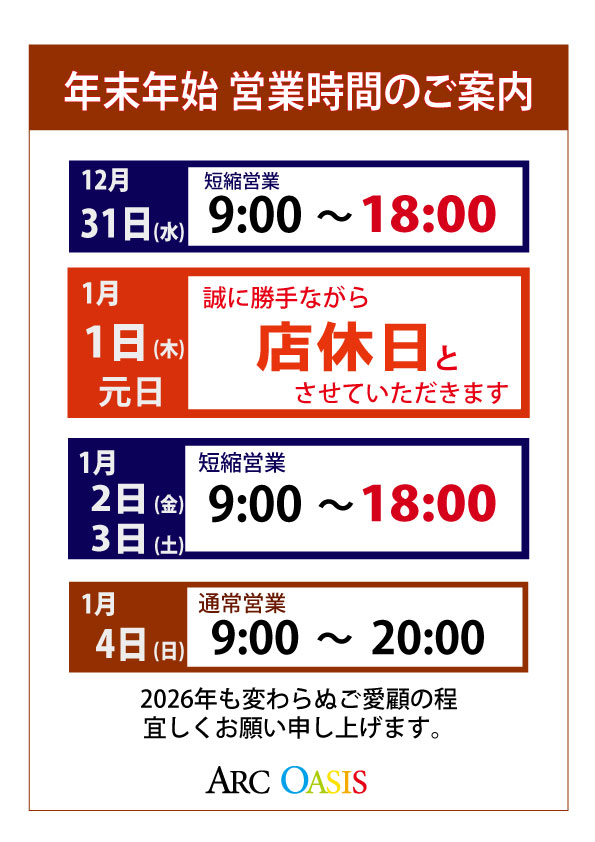 1/2(金)・1/3(土) 短縮営業(9:00~18:00)