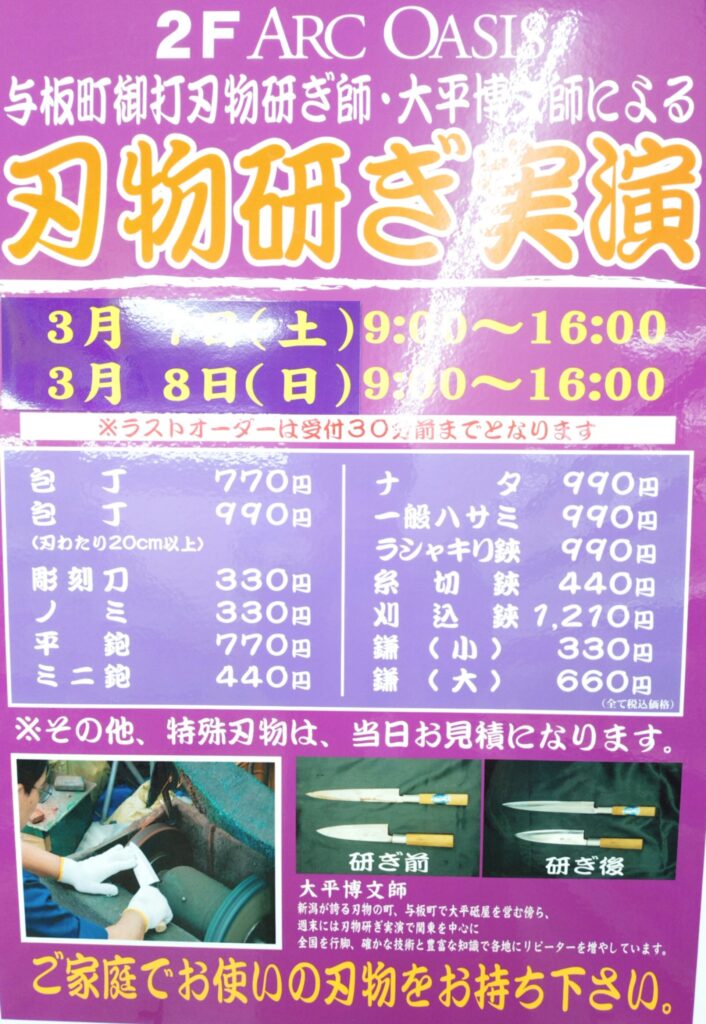 刃物研ぎ実演が開催されます。