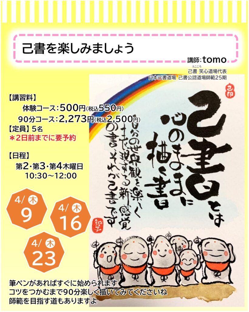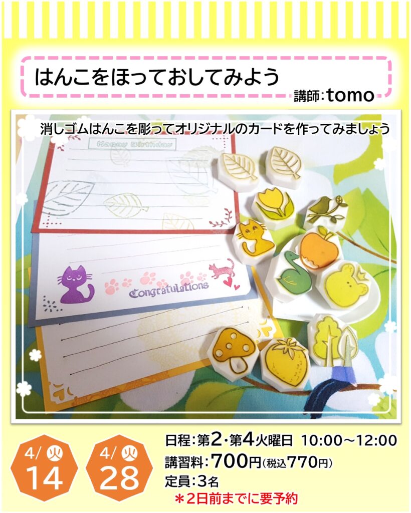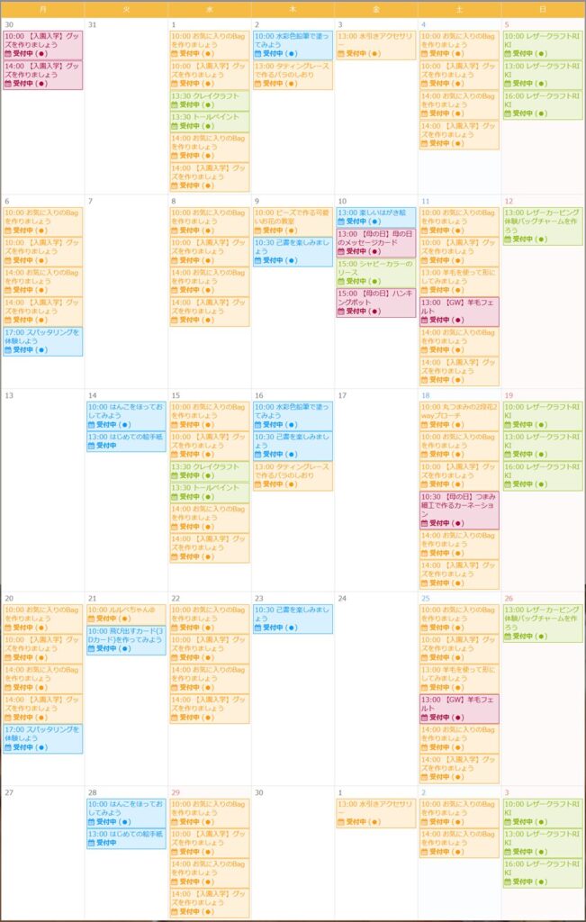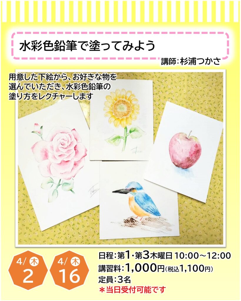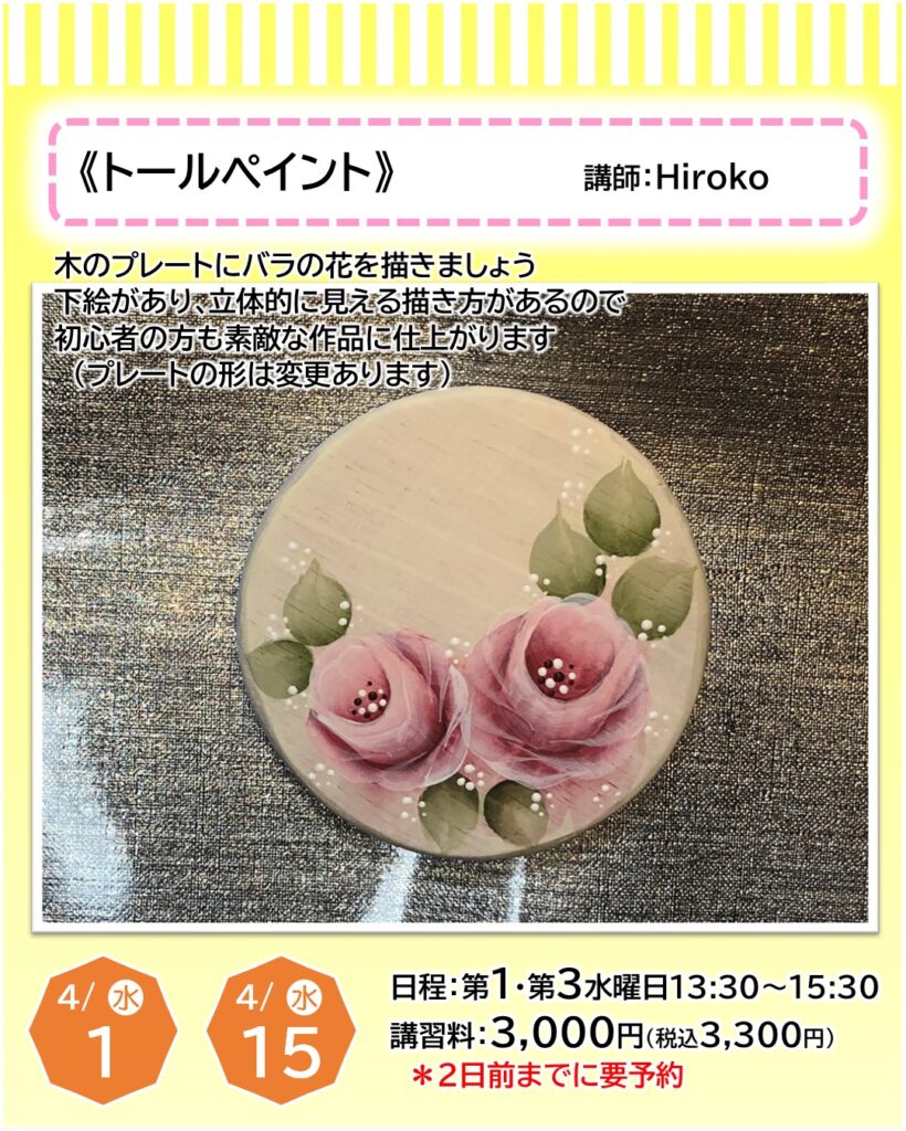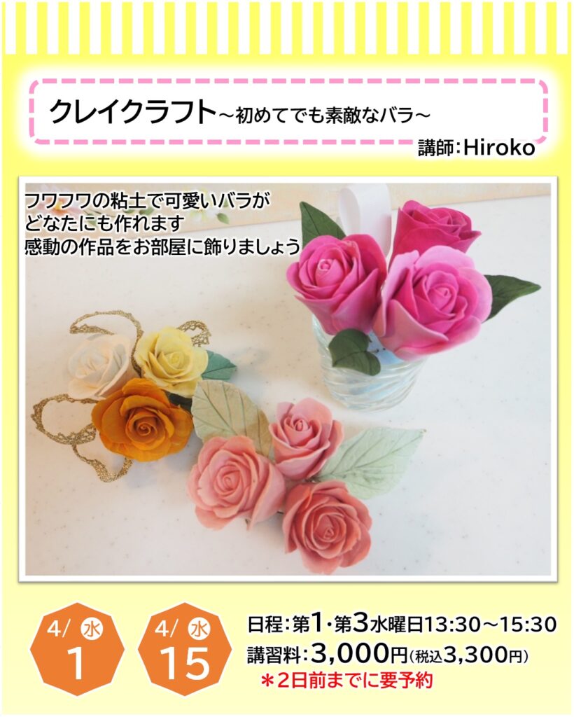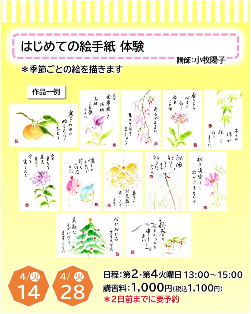 お知らせ カルチャー講師による一日体験【4月】日程をご紹介 2026年3月22日 寝屋川店 ●予約申し込みが必要となります・・・店頭、電話、ホームページにて受付しております●受付期限にご注意ください(日程はやむを得ず変更となる場合もございます)●教室内にてカルチャー生徒さんと同時受講となります(未開講の場合は体験者のみで実施いたします) 申込予約はこちら 一日体験日程 《4月ver.》 カレンダーを選択すると申込予約ページに移ります お知らせTOP
