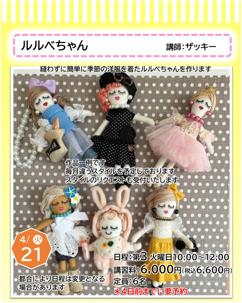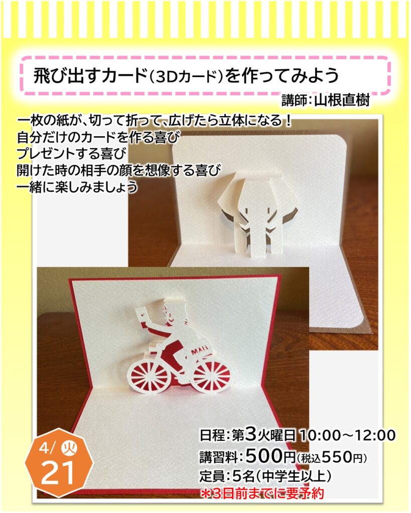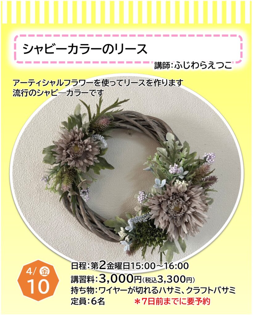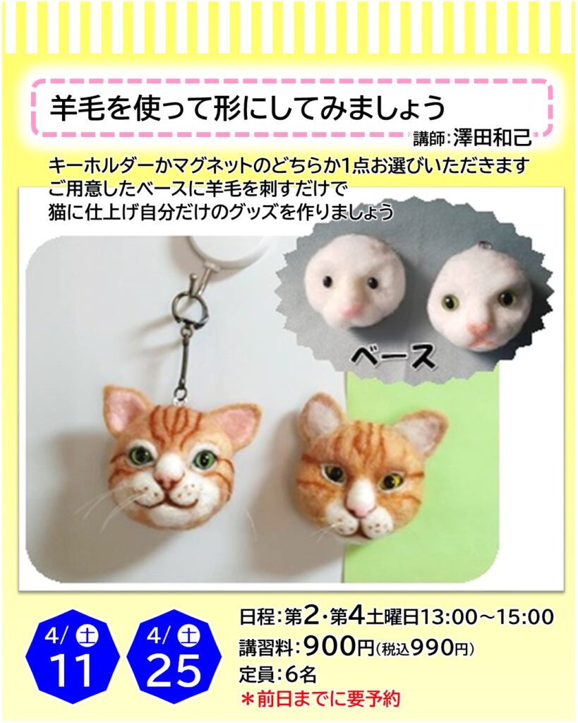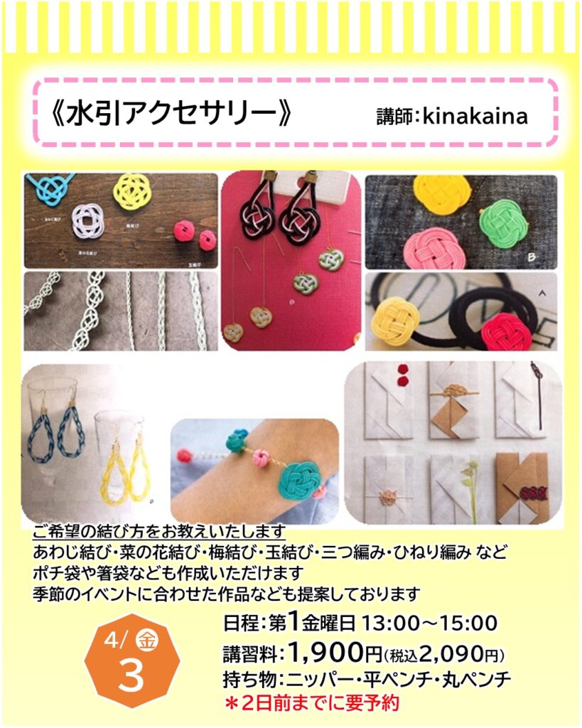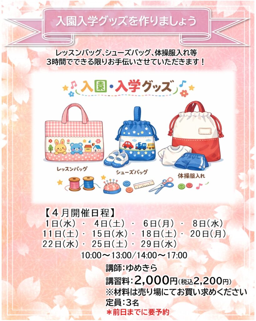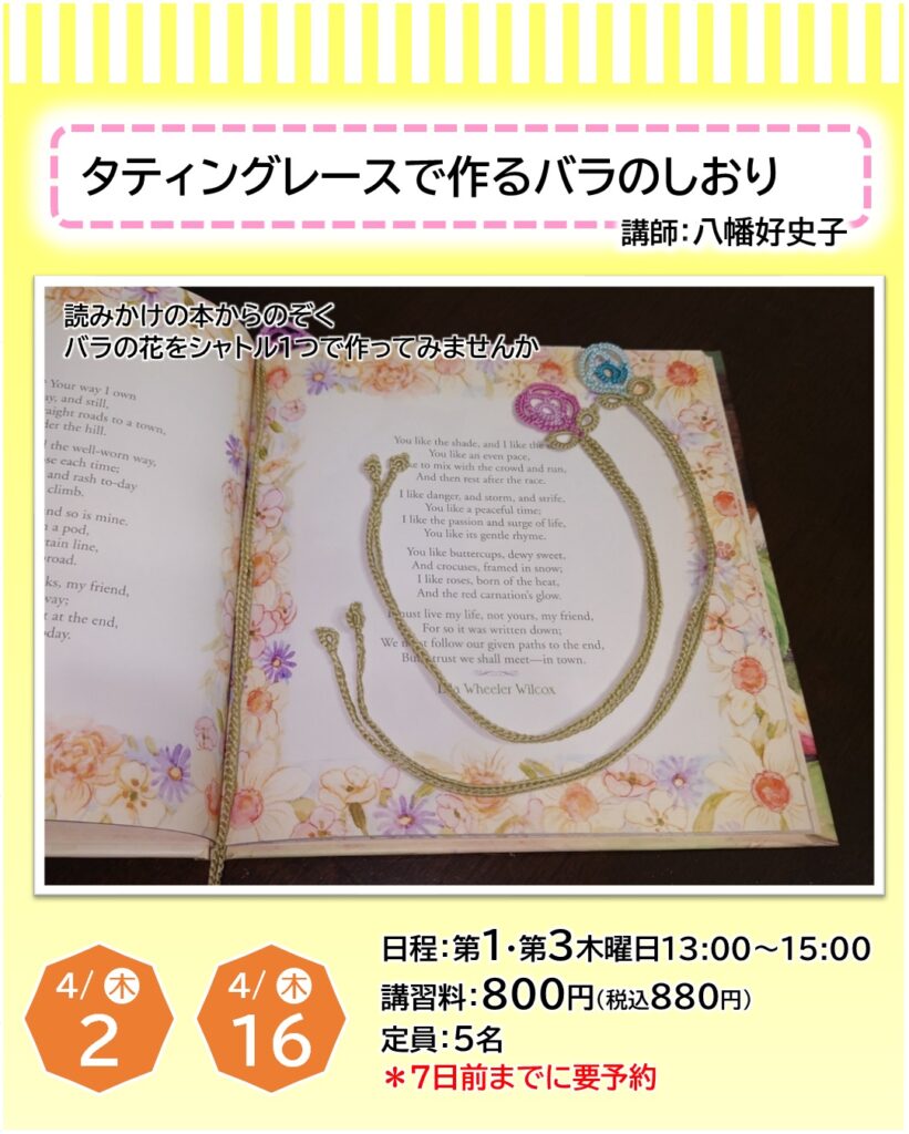 お知らせ カルチャー講師による一日体験【4月】日程をご紹介 2026年3月22日 寝屋川店 ●予約申し込みが必要となります・・・店頭、電話、ホームページにて受付しております●受付期限にご注意ください(日程はやむを得ず変更となる場合もございます)●教室内にてカルチャー生徒さんと同時受講となります(未開講の場合は体験者のみで実施いたします) 申込予約はこちら 一日体験日程 《4月ver.》 カレンダーを選択すると申込予約ページに移ります お知らせTOP