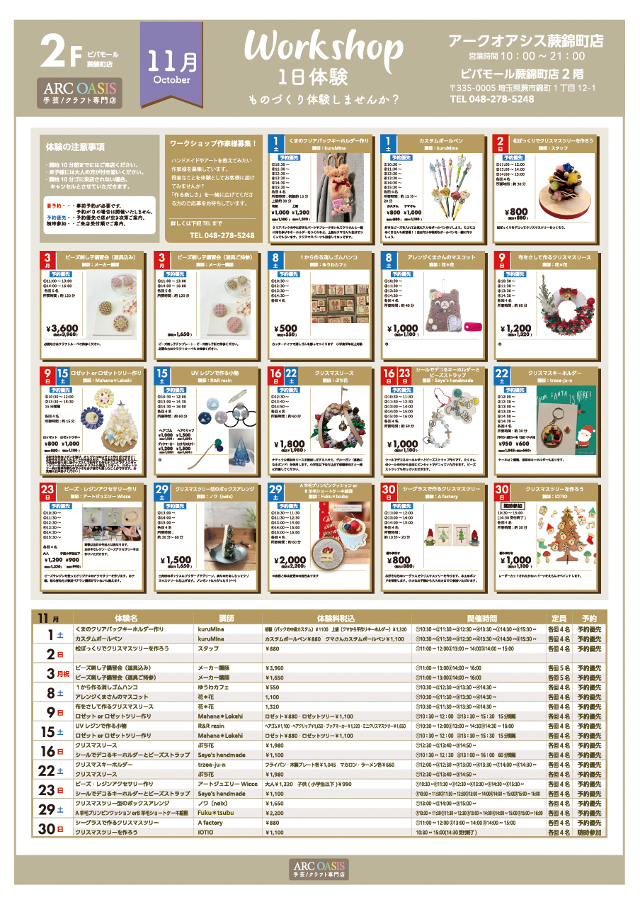 蕨錦町店11月ワークショップのカレンダーにつきまして、